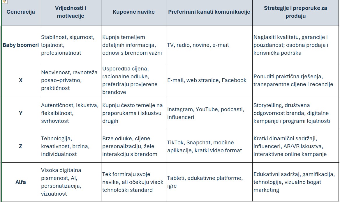 Starije generacije naglasak stavljaju na sigurnost i funkcionalnost. Mlađe generacije naglasak stavljaju na identitet, zajednicu i utjecaj na društvo. Generacija X često cijeni kvalitetu, pouzdanost i praktičnost. Više je vezana za TV, e-mail i tradicionalne kanale. Generacija Y kupuje iskustva, cijeni društvenu odgovornost brendova i preporuke, aktivna je na društvenim mrežama i koristi Internet za istraživanje proizvoda. Generacija Z preferira digitalne kanale, autentičnost, brzu informaciju i personalizaciju, najviše koristi kratke video formate, influencere i mobilne aplikacije. Generacija Alfa odrasta uz umjetnu inteligenciju i očekivat će potpuno interaktivno i tehnološki napredno iskustvo.